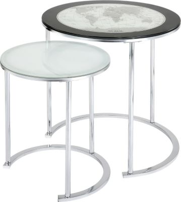 Enhance the look of your home with the extra serving space you get from these Powell world map nesting tables. Accented with a full geographical map of the world each has a glass top with shiny chrome plating for a modern look. The smaller table stores easily underneath the larger table to save space. Set of 2 nesting tables Large table has an elegant map design and black border Frosted glass tabletops on both Large table approx. 211/2" diameter x 23"HSmall table approx. 153/4" diameter x 19"HGlass and metal with chromeplated finish Assembly required Limited warranty Read more